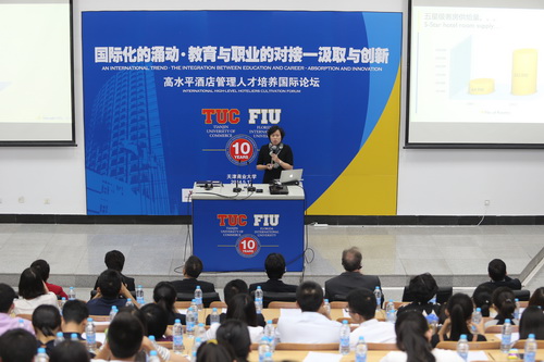 刘书瀚校长在演讲中回顾了中美合作酒店项目的发展历程 。他认为,伴随着国际旅游业的快速发展, 国际化的管理人才供不应求, 我们培养的学生保持着相当高的就业率, 普遍受到业界好评, 这充分证明在经济全球化的背景下, 国际化的人才必须用国际化的教育资源培养。十年合作,我们始终坚持选择优质的酒店管理专业品牌 ; 坚持计划内招生 , 确保生源质量; 坚持专业教师队伍的国际化; 坚持专业建设与社会需求岗位相对接,与酒店业国际大品牌建立了稳定的合作机制; 坚持将中外合作领域作为事业发展重点配置资源, 建立了国际化的国际教育交流中心,而更为重要的是通过我们的合作创造了一个被教育界充分认可的成功模式。