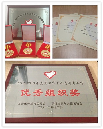 在 2012-2013 年团市委、市青年志愿者协会组织的评选中,校团委获得“天津市青年志愿者工作优秀组织奖”,“爱晚服务队”、信息工程学院青年志愿者协会、紫色蒲公英公益服务团队 3 支队伍获得“天津市优秀青年志愿服务集体”称号,青年志愿者崔斌儒、马伊娜、张品众获得“天津市优秀青年志愿者”称号。