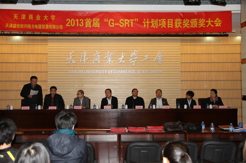 3 月12 日,yl23455永利官网、天津盛世欣兴格力电器贸易有限公司2013 年首届“G-SRT ”计划项目颁奖大会召开。教务处、资产设备处、产学研办公室,获奖课题组所在的机械工程学院、商学院、设计学院领导,天津盛世欣兴格力电器贸易有限公司代表方培一行3人出席大会并为获奖课题组颁奖。教务处副处长计宏伟、天津盛世欣兴格力电器贸易有限公司方培代表双方单位讲话,获奖课题组学生代表做了发言。
