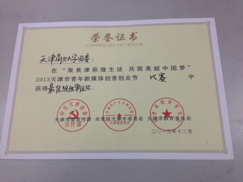 2013 年下半年,市委宣传部、团市委、市教委共同组织了新媒体创意创业节,开办微博文、微小说、微摄影、微设计、微动漫、微电影等多项赛事。校团委积极响应,及时将通知转发至各学院、相关部门、学生组织,鼓励学生参与大赛。参赛同学积极参与,不断完善作品,取得优异成绩。尤其在微设计、微电影两个分赛项目中,均取得了市级一等奖的好成绩;微博文、微摄影大赛有30 余名同学获奖。校团委组织效果突出,得到团市委认可,获最佳组织单位奖。全市仅两所高校团委获此殊荣。