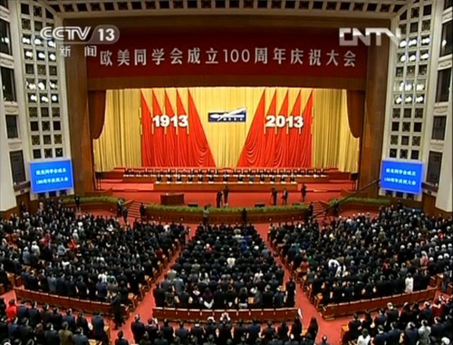 庆祝大会上,中共中央总书记、国家主席、中央军委主席习近平发表重要讲话。他强调,全面建成小康社会,推进社会主义现代化,实现中华民族伟大复兴,是光荣而伟大的事业,是光明和灿烂的前景。一切有志于这项伟大事业的人们都可以大有作为。只要广大留学人员同人民站立在一起、同人民奋斗在一起,就一定能为实现中华民族伟大复兴的中国梦书写出无愧于时代、无愧于人民、无愧于历史的绚丽篇章。 中共中央政治局常委俞正声、刘云山到会祝贺。庆祝大会由全国人大常委会副委员长、欧美同学会副会长陈竺主持。全国政协副主席、欧美同学会会长韩启德在会上讲话。共青团中央书记处第一书记秦宜智代表人民团体致贺词。清华大学生命科学学院院长施一公代表留学人员分别发言。部分在京中共中央政治局委员、全国政协领导同志等到会祝贺。有关方面负责同志、各行业归国留学人员代表、海外特邀代表共约 3000 人参加大会。