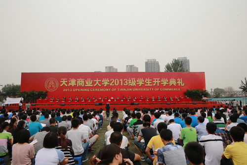 开学典礼在庄严的国歌声中开始,商学院黄聚河教授代表全体教师发言,中国人民大学博士生导师贾根良教授作为校友代表发言,TUC-FIU 合作学院酒店管理(中美合作)专业周雯同学代表全体 2013 级新生发言。校领导为 2013 级新生代表佩戴校徽,全体新生佩戴校徽并向校旗庄严宣誓。