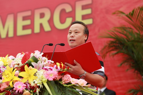 校长刘书瀚发表热情洋溢的讲话,代表学校全体师生员工对新同学的到来表示热烈的欢迎,向培养这些新同学健康成长的家长表示诚挚的问候,并对 2013 级新生寄予殷切希望:第一,希望全体 2013 级新生加强德育修养,做品德高尚的人。特别是经过大学阶段的学习要诚信初衷更坚定,智慧能力更强大,毕生为造就诚信社会发挥影响力和推动作用。第二,希望全体 2013 级新生勤于学习,做基础知识牢固、专业能力精深的人。特别是要珍惜大学时光,充分利用学校提供的学习环境和教育资源,认真规划大学学业生涯,对学校规定的基础课程注重学深学透全面掌握;对学校提供的主干课程注重掌握理论、体系和方法;对学校给予的专业选择机会注重依靠自己的学业实力,根据自己的喜好和职业期望理性选择,高效率学习。第三,希望全体 2013 级新生注重理论联系实际,做实际工作能力强,有市场竞争力的人。特别是能够充分利用实践教学、社会调查、第二课堂活动等各种形式的学习机会,努力培养勤于思考、敢于创新、勇担责任、善于交往、与人合作的能力,形成竞争优势、毕业后能在商战驰骋中挥洒自如,靠品德、智慧和勤奋不断获胜。能够向成功校友学习,了解校友的成功之路,借鉴校友的成功经验,并争取得到校友的直接帮助,在未来的发展道路上少走弯路、赢得时间。