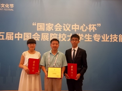 在决赛现场,郑舒航和刘欢同学对“2014 中国(武汉)国际生物医药产业展览会”的策划背景、策划主题、推广方案、主要活动、财务分析、风险分析和应急预案等方面进行了详细展示和讲解,凭借精彩而充实的策划内容、出色的演讲技巧、良好的礼仪形态得到了专家评委、企业评委及在场观众的认可,最终获得优秀奖。郑舒航和刘欢荣获“中国会展优秀大学生”称号,杨琪博士荣获“优秀指导教师奖”。