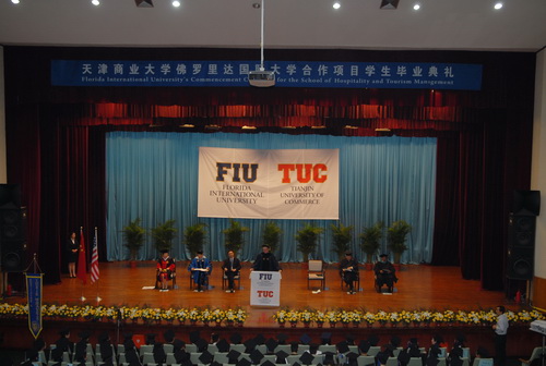 5 月7 日上午,TUC-FIU 合作学院酒店管理专业2013 届毕业典礼暨 FIU 酒店管理理学学士学位 授予仪式在科学会堂举行。天津市人大常委会原副主任、中国外商企业投资协会副会长王述祖先生、yl23455永利官网校长刘书瀚博士、佛罗里达国际大学校长 Mark B. Rosenberg 博士、 FIU 酒店管理学院院长 Mike Hampton 博士等出席了典礼并致辞。 TUC-FIU 合作学院酒店管理专业的教师和 232 名学生以及学生家长参加了典礼。 TUC-FIU 合作学院院长王文君博士主持了典礼。张静同学代表全体毕业生在庆典上发言。