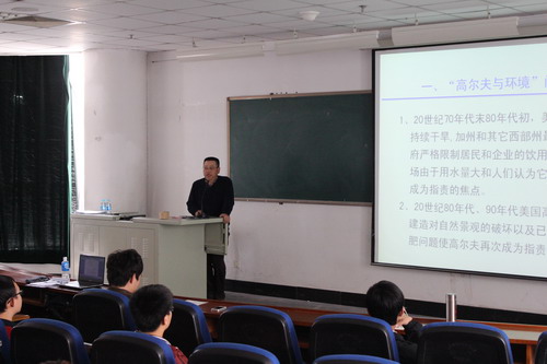 下午,韩烈保教授为高尔夫专业学生做了 “ 高尔夫球场对环境影响的探究 ” 的学术报告。他结合已有的科研成果,深入浅出地从高尔夫球场可以提高土地利用,改善生态环境;高尔夫球场用水量比较;高尔夫球场施用农药和化肥是否对环境造成危害等方面分析了高尔夫球场与环境的关系,并就球场用地、环境政策等方面提出自己的见解。