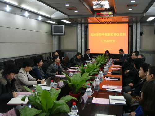 1 月 28 日 下午,高校年轻干部到红桥区挂职工作总结会在永利官网召开。市委教育工委副巡视员、干部处处长张弢,红桥区委常委、组织部部长唐瑞生,校党委副书记史习红出席会议。市委教育工委干部处、红桥区委组织部相关领导、挂职干部派出高校组织部部长、接收单位负责人及高校挂职干部等共 20 余人参加会议。总结会由市委教育工委副巡视员、干部处处长张弢主持。