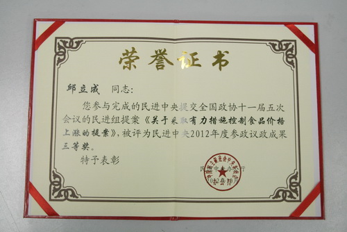 参与完成的民进中央提交全国政协第十一届五次会议的民进组《关于采取有力措施控制食品价格上涨的提案》,被评为民进中央 2012 年度参政议政成果三等奖。