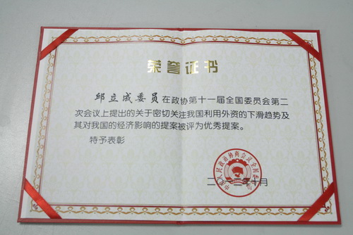 副校长邱立成在全国政协十一届二次会议提交的《关于密切关注我国利用外资的下滑趋势及其对我国的经济影响的提案》被评为“优秀提案”。