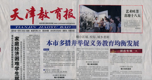 9 月 28 日 ,《天津教育报》在报眼位置以 “ 艺术吐芳,喜迎十八大 ” 为题报道了永利官网艺术学院的艺术作品展。报道原文:“ 9 月 26 日 ‘艺术吐芳 文化礼赞’yl23455永利官网艺术学院喜迎‘十八大’艺术作品展开幕。师生们用色彩构筑的视觉画卷表达对党的热爱之情。”