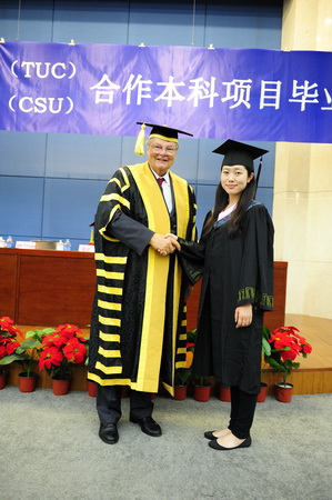 在澳大利亚欢快的乐曲声中,国际教育学院院长田海龙教授宣读了获得澳方商务研究学士学位的学生名单。澳查尔斯特大学校长 Lawrence Willett 、商学院商学系主任 John Atkinson 共同为获得学士学位的毕业生颁发了证书。