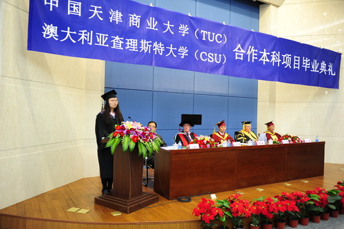 典礼首先由澳大利亚查尔斯特大学校长 Lawrence Willett 致辞,他表达了自己对 2012 届毕业生的良好祝愿,并希望两校的合作办学关系更加紧密。之后,副校长葛宝臻教授在典礼上讲话,他向远道而来的客人及学生家长表示了欢迎,并向获得澳方商务研究学士学位的同学们表示祝贺,同时鼓励大家抓住历史机遇,立志图强,并希望同学们心系师生情谊,关心母校发展。