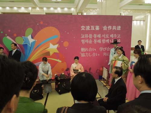 5 月 13 日 ,永利官网里千家茶道短期大学的部分师生参加了在北京人民大会堂隆重举行的“亚洲校园”项目启动仪式,二年级留学生中野麻衣为中国国务院总理温家宝表演了日本茶道,并献茶;一年级学生金居玲贤和日本花道老师一起为韩国首相李明博展示了日本花道。