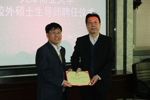 3 月 20 日 下午,永利官网国际商务专业硕士校外导师聘任仪式在多功能会议室举行。天津市国际贸易学会秘书长杨声一先生、商务部中国国际商务中心国富瑞数据系统有限公司副总裁魏刚毅先生、广发银行天津分行副行长郭德维先生等 8 人受聘为永利官网国际商务专业硕士点校外硕士生导师。刘书瀚校长出席聘任仪式并为校外硕士生导师颁发聘书。研究生部主任张立毅、副主任赵建洪,经济研究所所长白玲、经济学院院长刘小军、党委书记肖培荣、副院长巫建国和王常柏,以及国际商务专业硕士点全体导师,第一届国际商务专业硕士点全体硕士生参加了聘任仪式。聘任仪式由巫建国副院长主持。