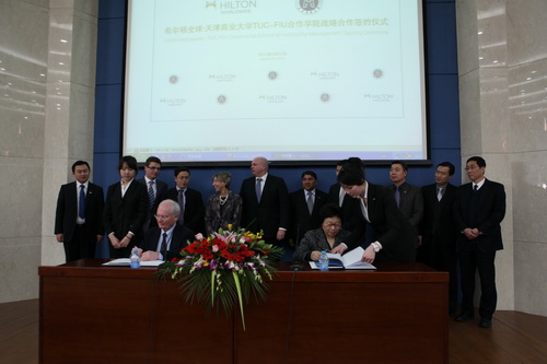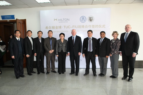 3 月 12 日 , TUC-FIU 合作学院与希尔顿全球( Hilton Worldwide )正式签署了合作协议,旨在为迅速发展的中国酒店业培养更多符合业界要求的高素质、有能力的人才,并期望通过此次合作,探索新的高校与企业联合培养人才的双赢合作模式。希尔顿全球人力资源高级副总裁 Dave Osborn ,希尔顿全球项目发展高级副总裁 Weehao Lee ,希尔顿全球亚太区资深高级人才招募总监 Jason Soh ,教务处处长于义良、学工部部长贾青, FIU 酒店管理学院副院长 Mohammad Qureshi 教授、副院长 Dianne Newman 教授和助理院长 Jonathan Pernick 教授,合作学院全体院领导出席了签字仪式。