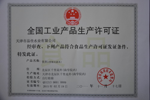 9月22 日由天津市生产许可审查中心组织的专家组对永利官网后勤所属品佳水业有限公司进行为期三年一个周期的现场换证审查。期间,专家组对企业生产销售相关50 项纪录以及净化洁净标准、桶装水计量标准、生产设备及环境等进行了认真审查,所有现场审查的各项指标均合格,专家组现场抽样送检产品经过天津市质检部门检验全部达标。12月初,天津市质量技术监督局为品佳水业有限公司颁发了新的 QS 工业产品生产许可证。