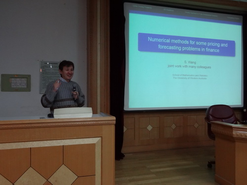 在报告会上,汪崧教授用通俗的语言及典型的案例介绍了他在“金融领域中有关期权定价、预测问题”领域所作的一些工作,主要包括金融市场期权定价的自由边界问题、 HJB 方程与互补问题的罚方法、基于节点样条插值优化的金融产品定价的短期预测问题等方面的取得的研究成果。