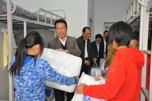 校党委书记陈学奇和校长刘书瀚在慰问过程中,详细询问了同学们的学习、生活情况,与同学们进行了亲切的交流,并将过冬的棉被、毛毯等慰问品发放到学生手中,鼓励同学们要树立信心,克服困难,珍惜时间,积极进取。
