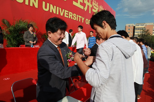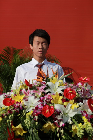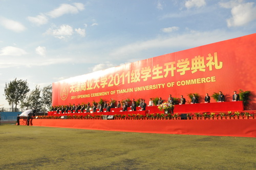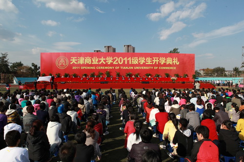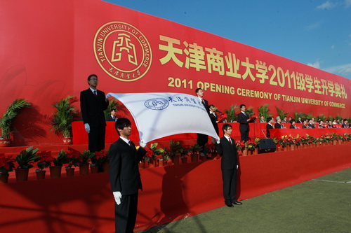 开学典礼在庄严的国歌声中开始。机械工程学院教师张晨阳代表全体教师发言,2011 级经济学类学生李润泽代表全体新生发言,师生共同对2011 级学生即将开始的大学生活寄予了美好的期望与祝愿。校领导为2011 级新生代表佩戴校徽。6054 名本科及研究生新生戴上校徽并向校旗庄严宣誓。