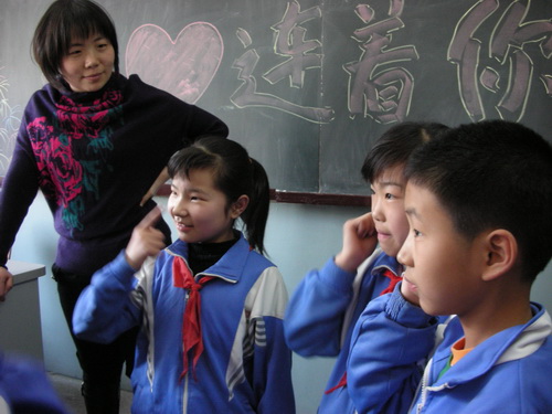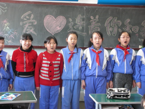 佳园里小学五年一班由32 名学生组成,其中10 名学生为农民工子女,3 名家庭经济困难生,志愿者们为他们分发准备好的书籍、文具,并与他们一起玩“指五官”游戏互动,当食指在孩子们的五官“慌忙奔走”时,他们个个乐此不疲、笑逐颜开。五年一班的同学们同样用节目表示他们的感谢:课文《草原》的集体朗诵及歌曲《同一首歌》的演唱尽显孩子们的真诚和感激。