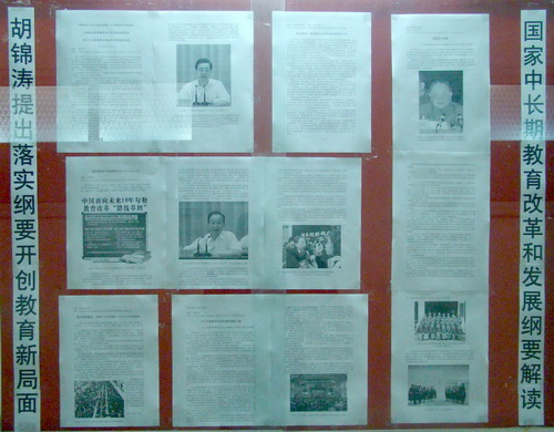 本次宣传栏是为了全面落实国家教育改革和发展规划纲要、配合学校即将开展的“2011年教学质量月”活动,特别推出的;宣传栏的大字标题是:胡锦涛提出落实纲要开创教育新局面,国家中长期教育改革和发展纲要解读。