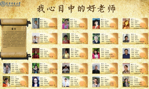 “我心目中的好老师” 评选活动是在 2012-2013 年学校教师课堂教学评价基础上,从各学院(教学部)中选出 22 位候 选人,通过大学生网络投票和线下投票 ,评选出 10 名教师获得“我心目中的好老师”奖,他们是:经济学院李颖,商学院林枚、纪寿乐、唐洋,设计学院汤娜,外国语学院赖辉、胡茵芃,公共管理学院王雪丽,理学院刘振航,体卫部孙志军。12 名教师获“我心目中的好老师”提名奖,他们是:外国语学院巩佳芳、朱蕾,公共管理学院闫乃权,机械工程学院石岩,生物技术与食品科学学院闫亚丽,艺术学院王焕嘉,法学院齐恩平、 张春普,大学外语教学部苑春鸣,信息工程学院王光艳,马克思主义学院初明利、张富生。
