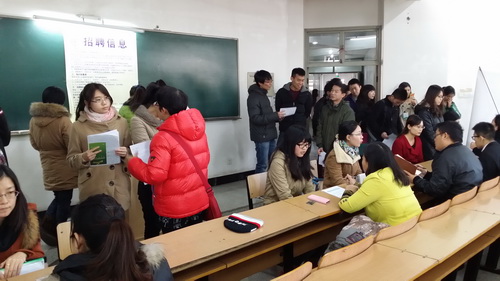 11 月 28 日 下午,由天津校友会和学生处就业指导中心联合举办的首届校友企业及校友所在企业校园招聘会在第三教学楼举行。南京天加空调设备有限公司、泰康人寿天津分公司、润茂集团、云信天恒投资管理有限公司、乾海国际货代公司等 14 家校友企业及校友所在企业参加了招聘会,向全校毕业生提供了 100 多个就业岗位,近 400 名学生前来应聘。副校长、校友总会会长马三津,校友总会副会长张堃到招聘现场看望了来校招聘的校友,并就天津校友会明年的工作重点与校友进行了交流。“学生成长促进协会”的同学为招聘会提供了服务。