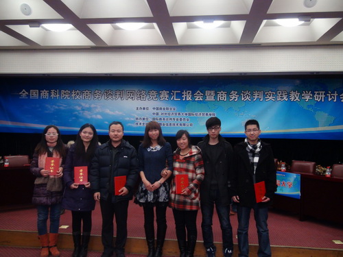 12 月20日,2013 年全国商科院校技能大赛商务谈判网络竞赛颁奖典礼在北京举行,永利官网代表队在竞赛中获得团体全国二等奖,经济学院参赛学生国际商务研究生刘秋红、穆银虎、彭志芳,国际经济与贸易系陈涤石、刘亚婷在指导老师王威、辅导员杜志惠老师的带领下参加了颁奖典礼。