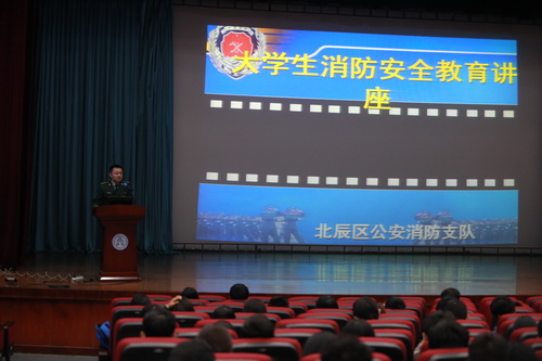10月21 日下午,学校在科学会堂举行大学生消防安全教育讲座,邀请天津市北辰区公安消防支队参谋刘松为全校1000 余名学生骨干进行消防安全知识培训。