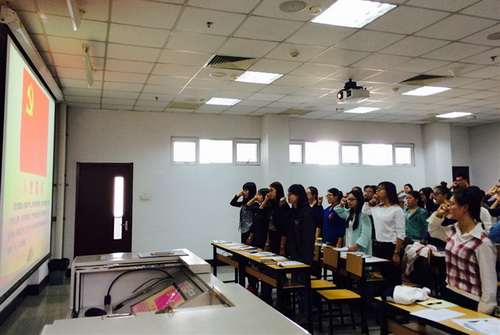 本次会议第一项议程是工作指导与培训。骆媛以新《党章》和《发展党员工作细则》为根本,以课件PPT为导读,从党员发展程序、新变化与重点内容、支部和党员的工作职责等方面进行了详细、重点讲解,为全体学生党员上了一堂生动的党课。第二项议程是工作要求与部署。骆媛从学生党员严以修身、严以律己、率先垂范、履职尽责、甘于奉献等方面对全体学生党员提出了明确的要求,并对党员责任区、党员联系班级责任制等工作进行了详细的部署和安排。第三项议程是责任承诺与宣誓。骆媛对党员责任进行了解读,全体学生党员签订了《学生党员责任制承诺书》,承诺书从 8 个方面自警、自省、自律、自查,为学生党员指出了明确而具体的努力要求,全体学生党员面对党旗庄严地许下了誓言,大会顺利圆满结束。