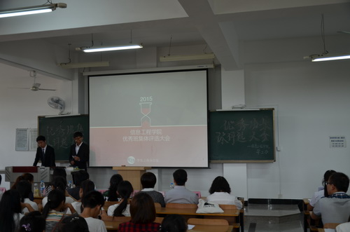 9 月 23 日,信息工程学院在 3 号教学楼 318 室举办了 2014-2015 学年优秀班集体评选活动。学院党委副书记王艳军、教学秘书毛莹、贺晓芳、辅导员郭君伟、金音,新生班主任代表耿艳香、崔海霞、张志鑫、李立鹏,相关学生干部及新生代表出席了本次活动并担任评委。 2015 级各班新生代表及学工办全体成员参加了此次评选活动。