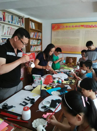 6 月 28 日 ,设计学院动画系党支部书记王涛、工业设计系党支部书记刘恒丽及党员教师李晓东等教师再次前往武清区河西务镇前白庙村开展第二期活动。本期活动的主题是“节约能源,保护环境”,通过自己的创意和创新,将旧纸杯进行再利用,不仅节约了资源,同时锻炼了孩子们创意创新思想和动手能力。