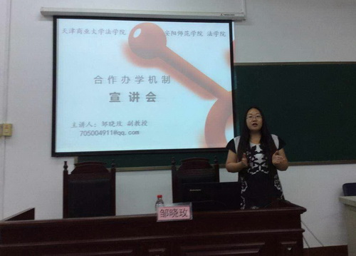 6 月 18 日,法学院副院长吴春雷、教授付林、副教授邹晓玫赴河南省安阳师范学院法学院举行合作办学宣讲活动。邹晓玫在安阳师范学院法学院举办的讲座上,全面介绍了yl23455永利官网法学院硕士研究生的招生政策及合作办学平台。会后,参与宣讲的教师与当地学生进行了亲切友好的交谈,耐心解答了研究生报考的系列问题。
