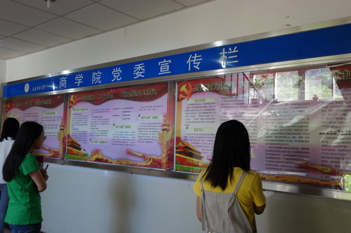 为了帮助党员群众认真学习领会“三严三实”、“四个全面”、“大众创业 万众创新”的内容和精神, 近日,商学院党委在商学院办公楼二楼推出《践行“三严三实” 推进作风建设》、《协调推进“四个全面” 引领民族伟大复兴》、《发挥智力优势 大力推进大众创业、万众创新》宣传栏。 本期宣传栏图文并茂,使学院师生观看宣传栏后,牢固树立宗旨意识和法纪意识,努力创新创业,有力推动学院的发展。
