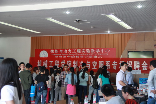 5 月 13 日下午,在学生处就业指导中心和保卫处大力支持下,机械工程学院在新实验楼一楼大厅举办了制冷专业专场招聘会, LG 电子、天加空调、丹华宏业等 22 家企业参会。招聘会由机械工程学院制冷系学生专业社团天商制冷学会主办。学院党政领导到现场指导招聘会具体安排,与招聘单位和学生交流,辅导员和制冷系主任全程参与。