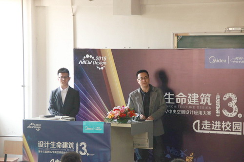 刘圣春首先回顾了往届天商学子参加 MDV 设计大赛取得的辉煌成绩,鼓励在场的学生再接再厉。随后律宝莹讲述了一些比赛需要注意的事项,他提到,想要赢得比赛首先要有一定理论知识与实践技能,掌握暖通专业设计软件,始终贯彻节能理念,同时要耐得住寂寞,不怕麻烦,整合专业知识,将理论联系到实际。