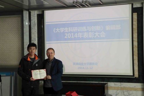 经编辑部推选,制冷及低温技术系 2012 级郭雨辰、生物工程 2011 级刘林两位同学获永利官网 2013-2014 年度优秀学生编辑纪念奖。计宏伟副处长为获奖同学颁发了奖品和获奖证书。