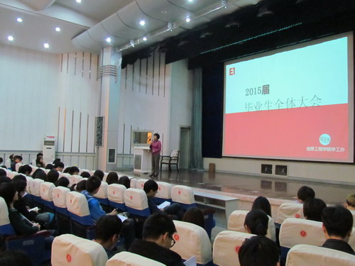 10 月29 日下午,信息工程学院在学术交流中心召开全体毕业生大会。院党委副书记王艳军,辅导员郭君伟、许兆光老师出席大会,全体 2015 届毕业生参加。