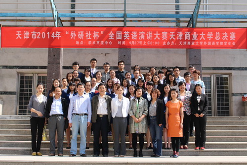 9 月27 日上午, 由教务处主办,外国语学院承办,大外部协办的2014 年“ 外研社杯”英语演讲校级决赛在学术交流中心举行。应邀出席并担任评委的有外国语学院副院长王永祥、副院长王占斌、岳福新副教授、大学外语教学部朱虹、杨惠媛、姜丽教授、以及英语外教江瑜婷。