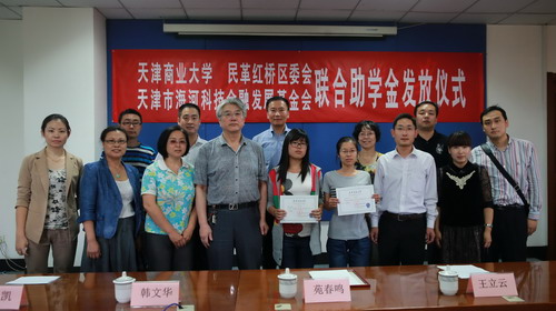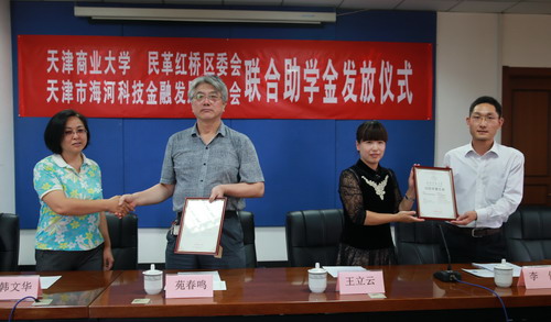 9月25 日下午,在校图书馆弘毅厅举行了民革红桥区委、 天津市海河科技金融发展基金会联合助学金发放仪式。民革天津市委副主任委员、民革红桥区主任委员苑春鸣,天津市海河科技金融发展基金会副秘书长李伟出席助学金发放仪式并为获奖学生颁发证书。yl23455永利官网统战部长王立云,学生处副处长孟国栋,红桥区统战部副部长韩文华,红桥区统战部党派工商科科长赵凯及相关学院的领导、部分学生代表参加发放仪式。