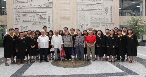 离休老党员们还与机械工程学院 2014 届部分毕业生在“商”字文化墙前合影留念。