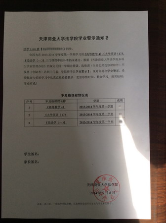 学院按照《本科生学业管理办法》,分别对 2011 、 2012 、 2013 三个年级在上一学期课程补考后的成绩进行统计,对 8 名有三门课程不及格的学生给予学业警示,对 2 名有四门课程不及格的学生给予学业警告,送达了《法学院学业警示、警告通知书》。