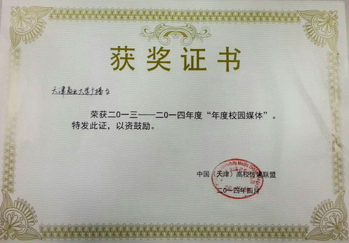 4 月20 日,2014 年中国(天津)高校传媒联盟年会在天津工业大学举行。会议选举了天津校媒第七届主席团成员,并举行了2014 年天津高校传媒联盟“年度校园媒体”评选大会,大会邀请到《中国青年报》首席记者张国等五名专业记者担任评委,每组展示后由评委提问答辩,根据展示和答辩表现打分。校广播台以88.44 的成绩获得广电类校媒第一的好成绩,荣获天津市 2013-2014 年“年度校园媒体”称号。