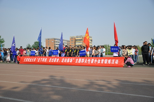 校团委、体育卫生部联合主办的“走下网络、走出宿舍、走向操场”主题群众性课外体育锻炼活动暨第十届体育节于4 月16 日开幕,15个学院的代表队入场后,体育卫生部教师代表杨学文、裁判员代表、运动员代表先后致辞、宣誓,正式拉开活动序幕。开幕当天,男女组别的篮球比赛开赛。本次大型体育锻炼活动涵盖足球、篮球、排球、健美操等8 个比赛项目,春季、秋季学期各举行4 项比赛。学生对活动充满热情,报名踊跃,预计本次活动将有超过1000 名同学参赛。 除全校性比赛外,各学院团委也组织了形式多样的体育锻炼活动,通过绳毽比赛、趣味运动会、三对三篮球赛等形式,组织大学生参加体育锻炼,此类型活动参与门槛低,趣味性强,让学生在娱乐的过程中,锻炼了身体素质,受到学生广泛欢迎。4 月 24 日 , 918 Disco Club 社团代表永利官网学生社团参加了天津团市委组织的“三走”活动 APP 揭幕仪式,并表演街舞,彰显大学生青春靓丽、积极向上的生活态度。