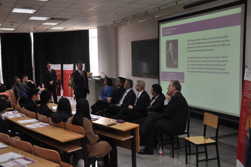 3 月 7 日, 全球著名酒店集团洲际酒店集团( IHG )大中华区华北中区运营总监、北京新云南皇冠假日酒店总经理 Roland Steiner 先生、洲际集团校园项目合作经理胡晓先生及中国北区人力资源经理叶朝霞女士一行 11 人专程到访TUC-FIU合作学院,共同探讨国际酒店人才培养模式并召开洲际集团校园专场招聘会招聘会。