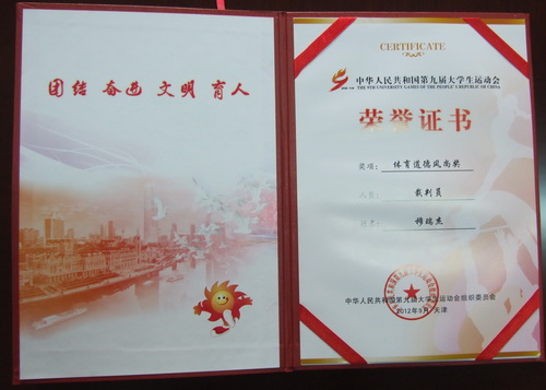 9 月 18 日,第九届全国大运会在天津工业大学闭幕。在大运会举办期间,受组委会邀请,永利官网体卫部穆瑞杰、霍静虹、杨学文、居阳、李广静、贾洪祥六位体卫部教师分别参加了田径、武术、排球、健美操、跆拳道及乒乓球项目的裁判工作,受到好评。其中,穆瑞杰荣获“第九届中华人民共和国大学生运动会优秀裁判道德风尚奖“,为广大裁判员树立了榜样,更为学校争得了荣誉。