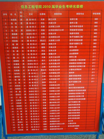 6月9日 ,信息工程学院在信息交流中心一楼推出 2010 届毕业生考研光荣榜与毕业生风采录。