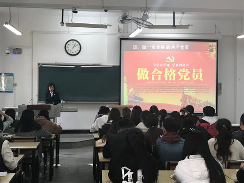 吕成捷分别从党章概述、历届党章回顾、十九大精神解读以及如何做一名合格的共产党员四个方面展开讲述。她要求大家端正入党动机,时刻用党员标准严格要求自己,无论在学习工作还是生活中,要时刻发挥党员的先锋模范作用。