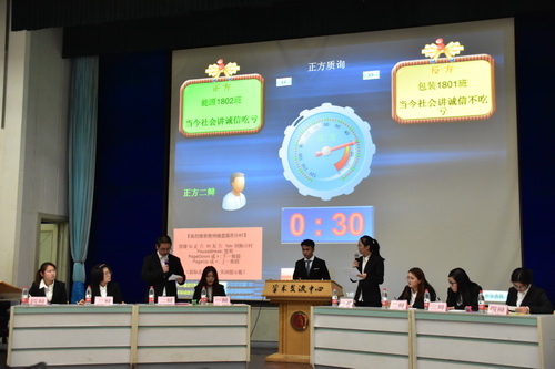 决赛中,正反两方就“当今社会讲诚信吃不吃亏”展开辩论。开篇立论时双方观点鲜明,论证充分,分析透彻严密。在自由辩论环节,辩手们你来我往,针锋相对,妙语连珠式的一问一答,精彩纷呈的正辩反论,异常激烈,“火药味”十足。总结陈词过后,评委进行打分并进行总结。最终,能源1802班辩论队获得冠军。