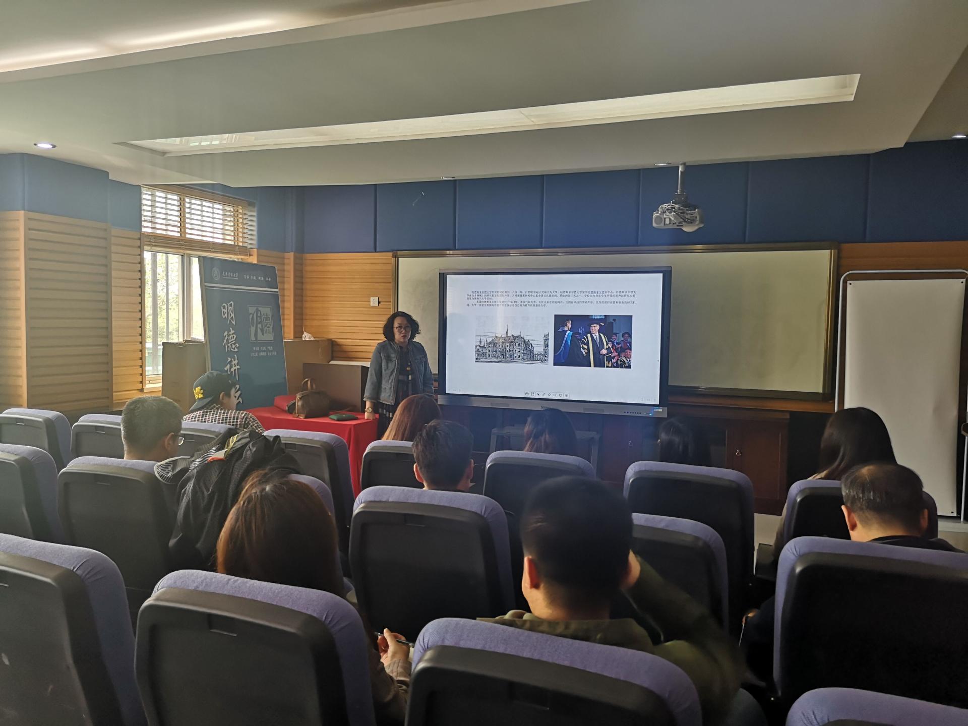 4月28日下午2点,艺术学院汤娜副教授赴英国访问研修归国总结汇报会在6号楼301报告厅举行。汤娜就2018年在英国哈德斯菲尔德大学184天访学研修期间的教学科研工作经验、收获等进行了总结汇报。